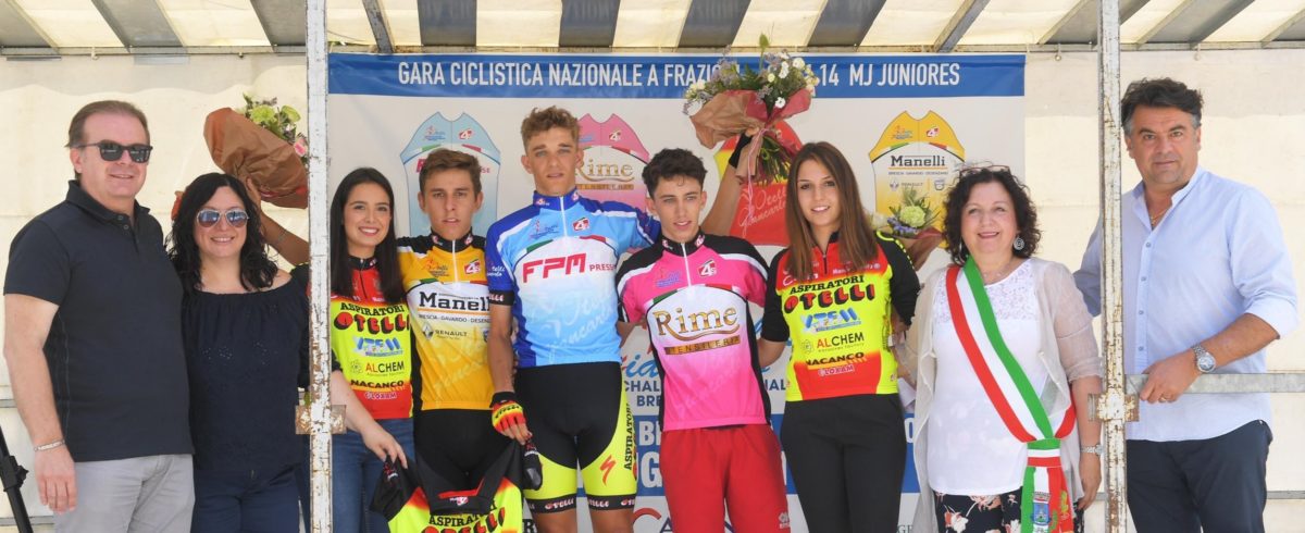Per Francesco Calì è stata una gioia tripla, perché oltre alla vittoria di corsa sono arrivate anche due maglie: quella di leader provvisorio di classifica generale (FPM Presse) e quella di miglior giovane (Aspiratori Otelli), essendo un atleta del primo anno. Altre due casacche consegnate: quella dei traguardi volanti (Concessionaria Manelli)- andata a Filippo Colombo (Feralpi Monteclarense) – e quella dei GPM (Rime Utensileria), indossata da Salvatore Giannini (Fosco Bessi Guspini).