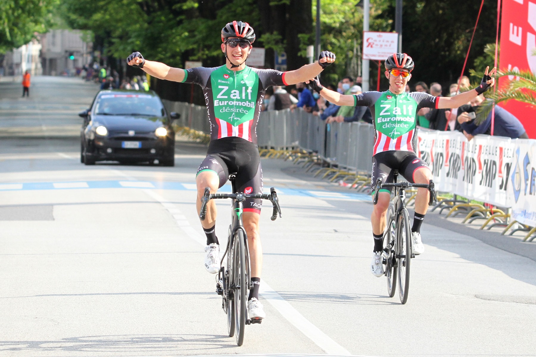 VITTORIO VENETO (TV) – Splendida doppietta della Zalf Euromibl Desirée Fior nella 65sima edizione della Medaglia d’Oro Frare De Nardi, gara per Elite e Under 23 corsa oggi a Vittorio Veneto. La formazione travigiana, praticamente sulle strade di casa, si è presa i primi due gradini del podio grazie al successo del 19enne trevigiano Federico Guzzo che ha anticipato il compagno di squadra e di avventura Alex Tolio, reduce dalla vittoria conquistata martedì scorso nelle Strade Bianche di Romagna.
