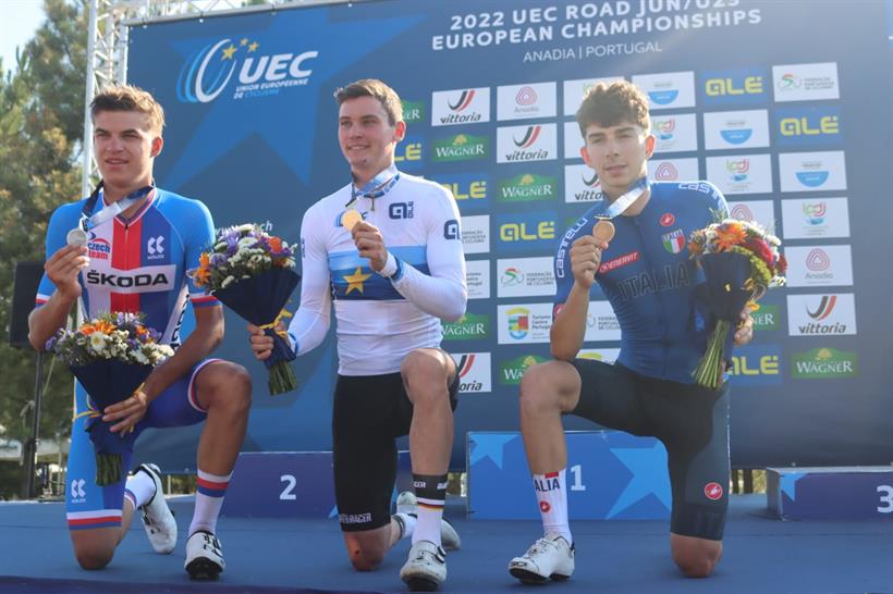 In un finale tiratissimo, il vicentino (nella foto di Federciclismo.it, sul podio) è stato bravo a inserirsi nell’azione a quattro che ha deciso il campionato continentale, giocandosi poi il successo mentre il resto del plotone cercava di chiudere vanamente il gap.