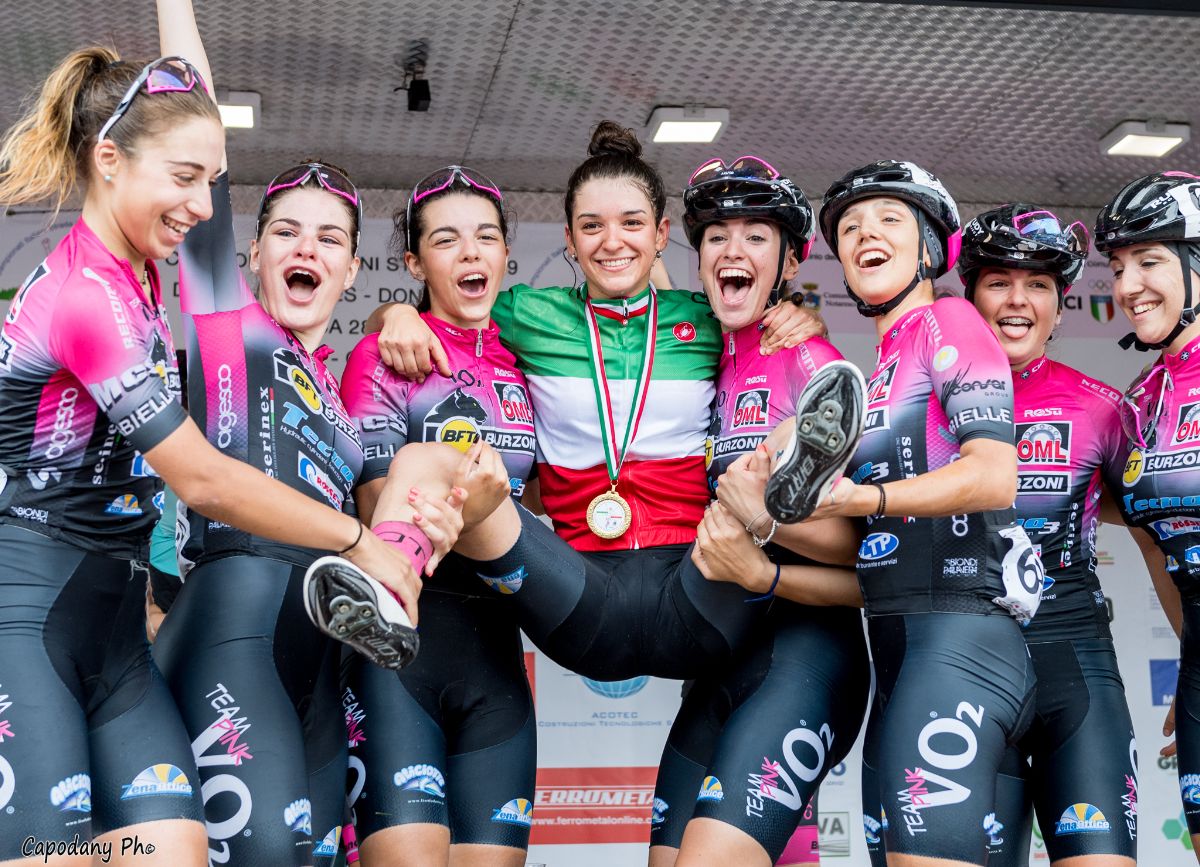 UNA PREDESTINATA – Classe 2002, quindi al primo anno nella categoria, la Gasparrini ha il palmares della predestinata: quest’anno si è laureata Campionessa europea su pista (Omnium e Quartetto) alla rassegna di Gand. E quella conquistata a Castellalto è la nona maglia tricolore della sua giovane carriera, tra strada e pista. Cresciuta ciclisticamente nella Rodman Pink Power, squadra della sua città San Dalmazzo di None, si è trasferita quest’anno alla VO2 Pink con il suo direttore sportivo Stefano Pairetti. Fa festa la squadra di patron Gian Luca Andrina, perché detiene un record singolare: nell’anno solare 2019 è andata a medaglie in tutte le rassegne tricolori a cui ha preso parte.