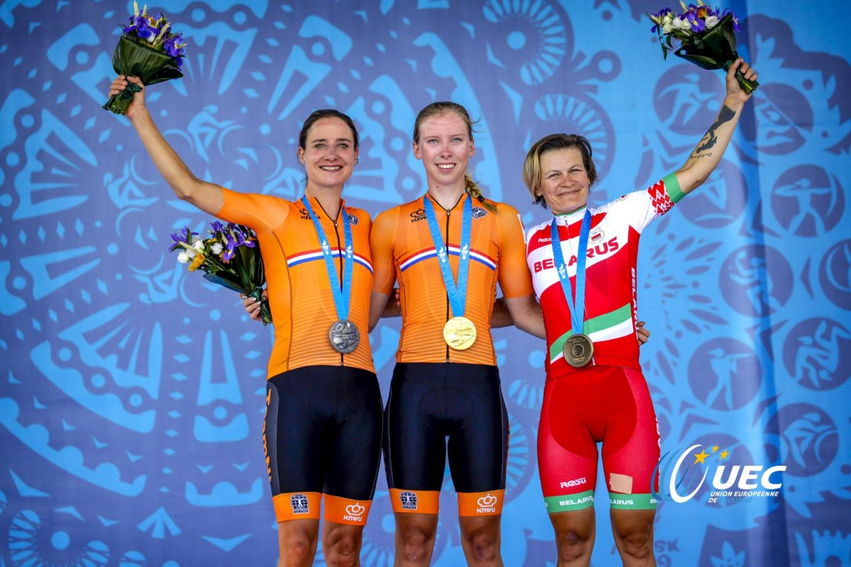 Il podio degli European Games Minsk2019, prova in linea femminile (foto UEC / Anton Vos / BettiniPhoto)