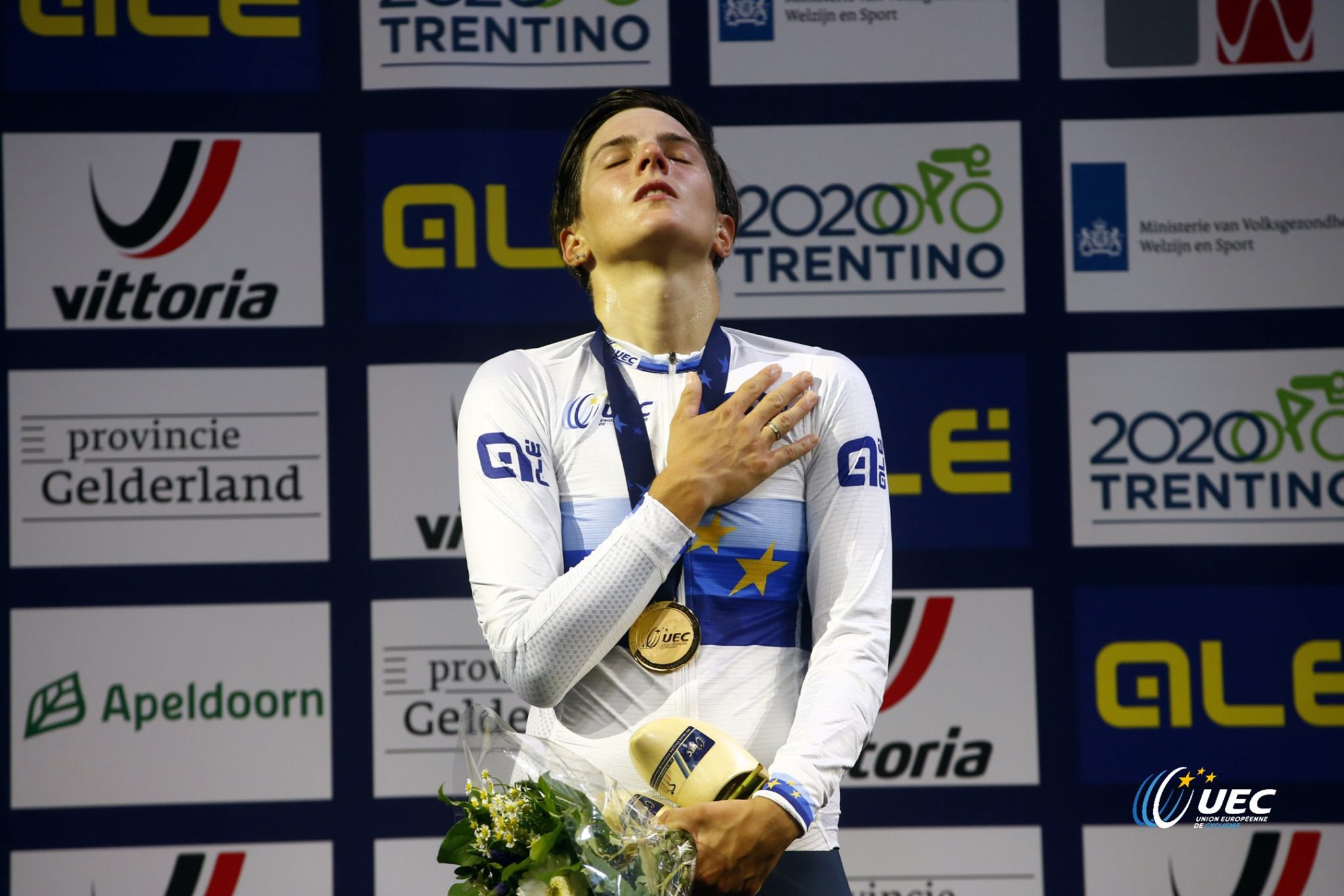 Maria Giulia Confalonieri mostra orgogliosa l’oro dell’Europeo della Corsa a punti (foto UEC/BettiniPhoto)
