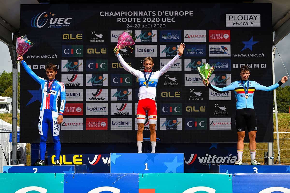 Il podio del Campionato Europeo strada Juniores a Plouay 2020 (foto BettiniPhoto)