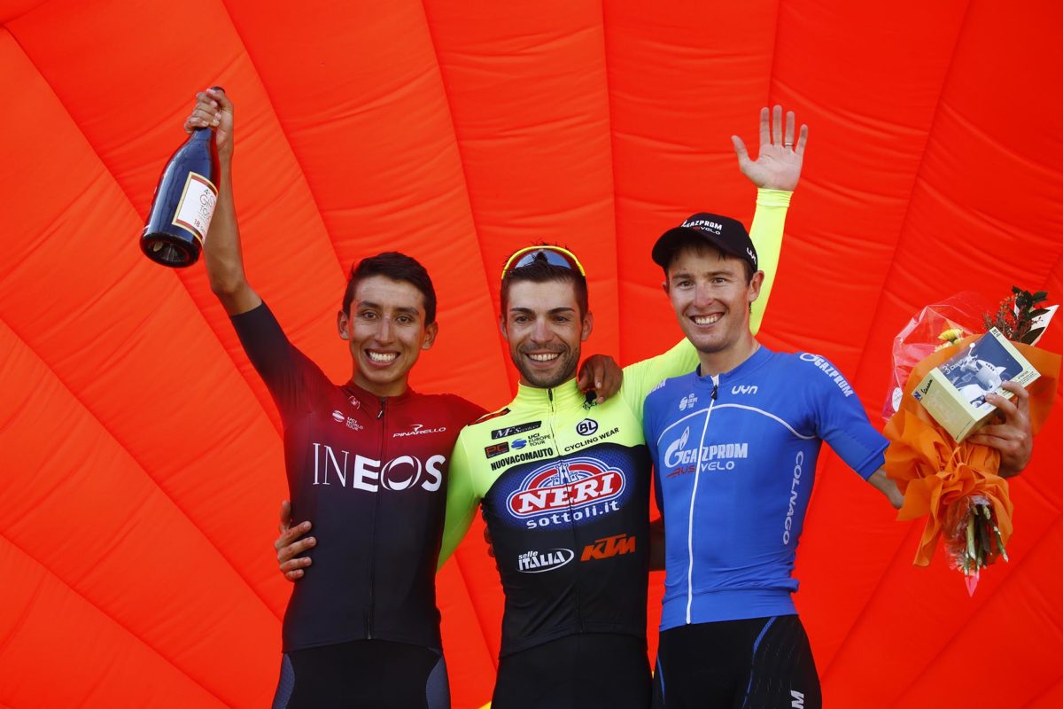 Ma è solo il preludio all’attacco del compagno di team Egan Bernal che arriva di lì a poco, quando manca poco più di un chilometro al Gpm. Il colombiano allunga con la stessa classe ammirata pochi mesi fa sulle strade francesi e l’unico a tenere la sua ruota è il russo Nikolai Cherkasov (Gazprom-Rusvelo). Bernal scollina per primo davanti al russo, poco più indietro insegue un terzetto composto da Merhawi Kudus (Astana), Pierpaolo Ficara (Italia) e Giovanni Visconti (Neri Sottoli).