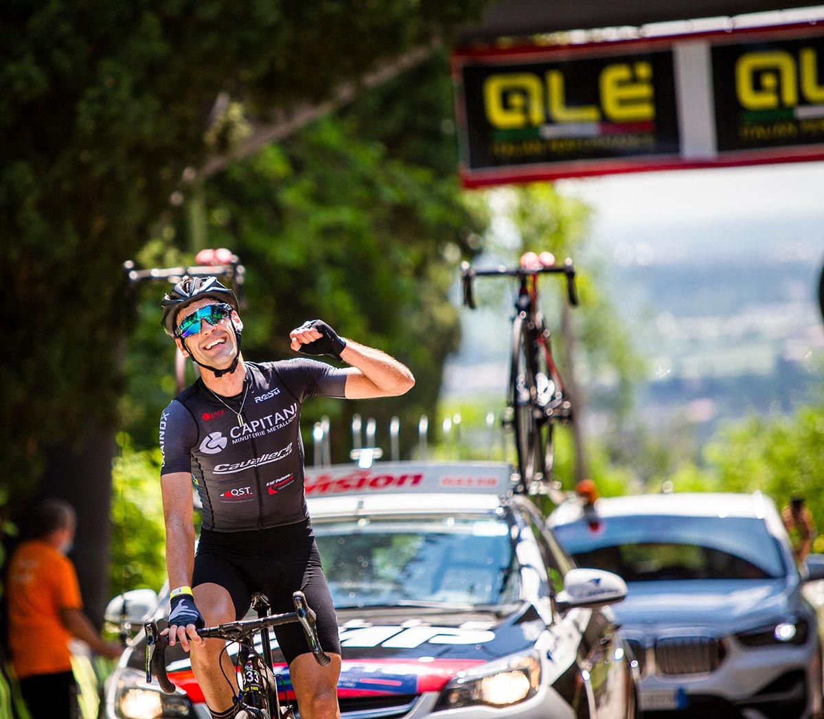 Cini, dopo l’ultimo tratto della salita condotto a tutta, prosegue con un’azione impetuosa in discesa e il suo vantaggio sugli inseguitori cresce ancora: la bandiera della Capitani Minuterie Metalliche percorre gli ultimi 50 km della granfondo da solo e passa il traguardo esultando a mani alzate dopo 129 km di gara.