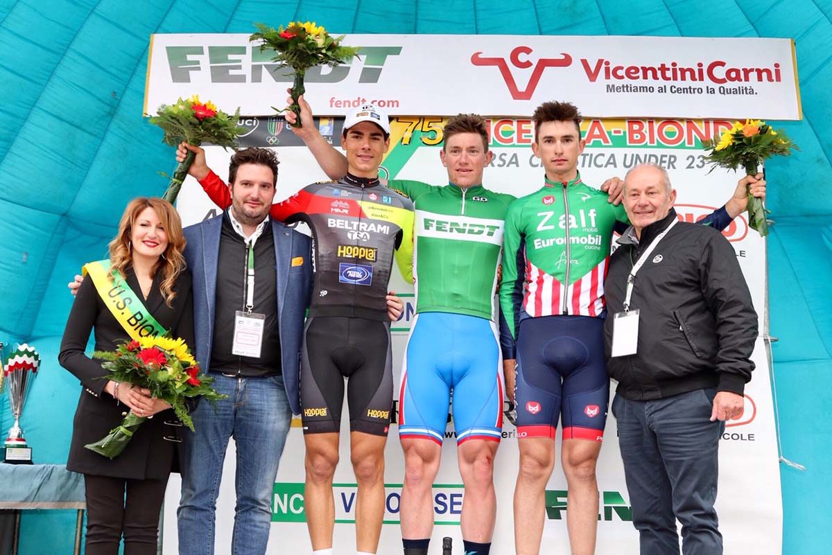 BIONDE (VI) – La 75esima edizione della Vicenza – Bionde parla russo con il successo di Gleb Syritsa (Lokosphinx), il più veloce nello sprint a tre che ha deciso la corsa. Battuti i compagni di fuga Filippo Baroncini (Beltrami Hopplà Petroli Firenze), secondo, e Gregorio Ferri (Zalf Euromobil Desiree Fior), terzo, con i quali ha dominato la scena negli ultimi chilometri della classica veronese per Under 23.