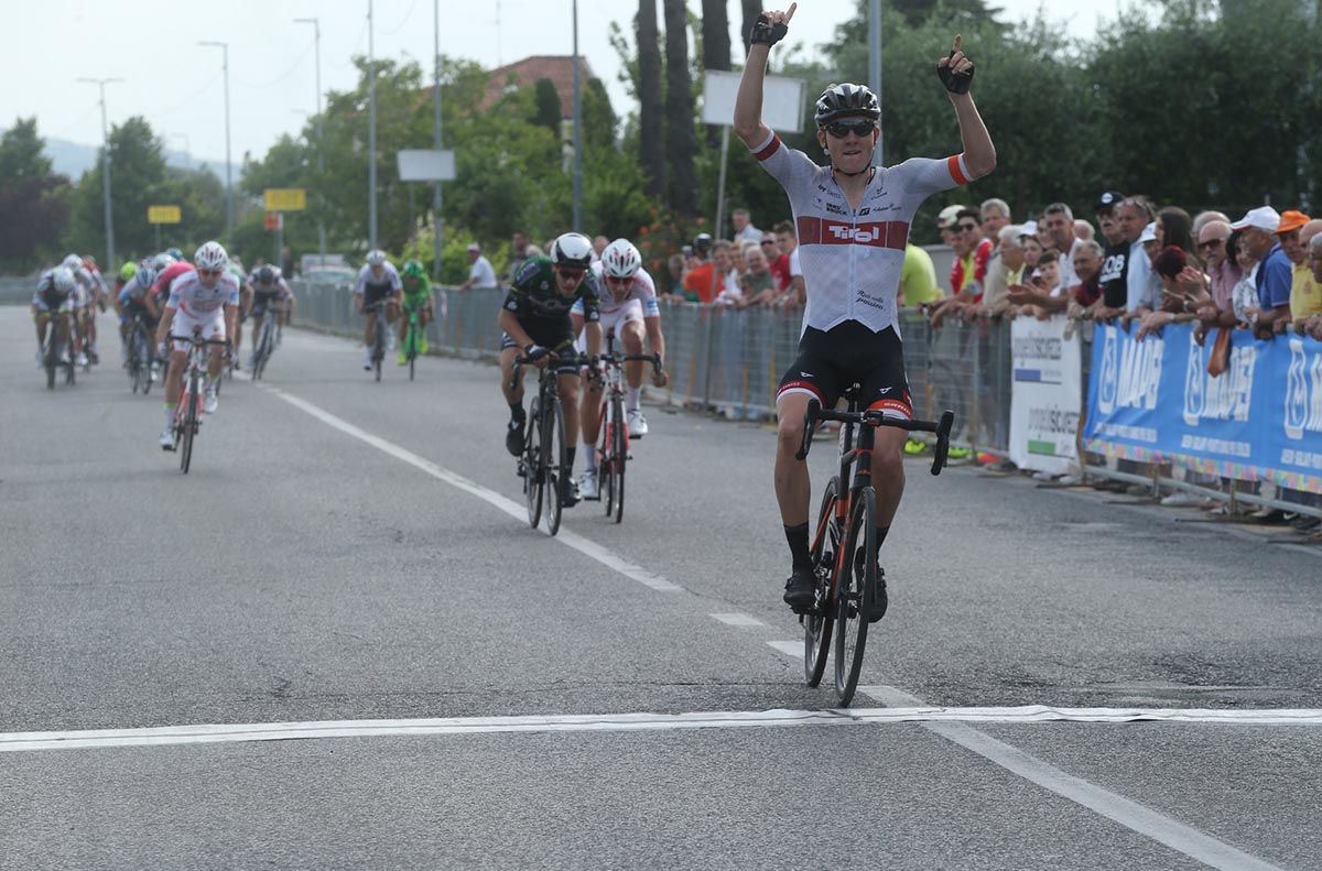A 10 k dalla fine i russi si mettono a dettare il ritmo della gara che vede ancora tutti i 40 atleti in lizza per il titolo. Sarà Filippo Zana, classe 1999, che proverà l’allungo sulla salita a 9 chilometri dalla fine. Alla sua ruota si mette il colombiano Rubio (Aran Cucine). Mente al traguardo cominciano ad assieparsi gli spettatori in attesa di applaudire il vincitore, i due al comando mettono circa 40 metri tra loro e le ruote degli inseguitori. Il gruppo non demorde e il loro vantaggio rimarrà tra i 12 e 6 secondi. Al GPM saranno il Zana, Zimmermann e Pugi a transitare per primi, il gruppo sempre a vista alle loro spalle. A 5 chilometri dal traguardo Rastelli si riporta sui fuggitivi, per un finale al cardiopalma. Ai 2 chilometri dal traguardo si trovano tutti in 15” con il gruppo in progressione. All’imboccatura del rettilineo appaiono tutti compatti e sarà Georg Zimmermann – Tirol KTM Cycling Team, a lanciare lo sprint ai 300 metri, lasciandosi alle spalle Luca Rastelli – Delio Gallina – bronzo Filippo Zana – Sangemini Trevigiani MGkVis.