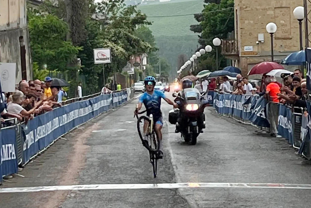 Sotto il diluvio, il corridore orobico ha festeggiato con un urlo di gioia e un’impennata sul traguardo la sua prima vittoria personale nella categoria Juniores. Una grande soddisfazione per lui e per tutta la società della Valle Seriana.