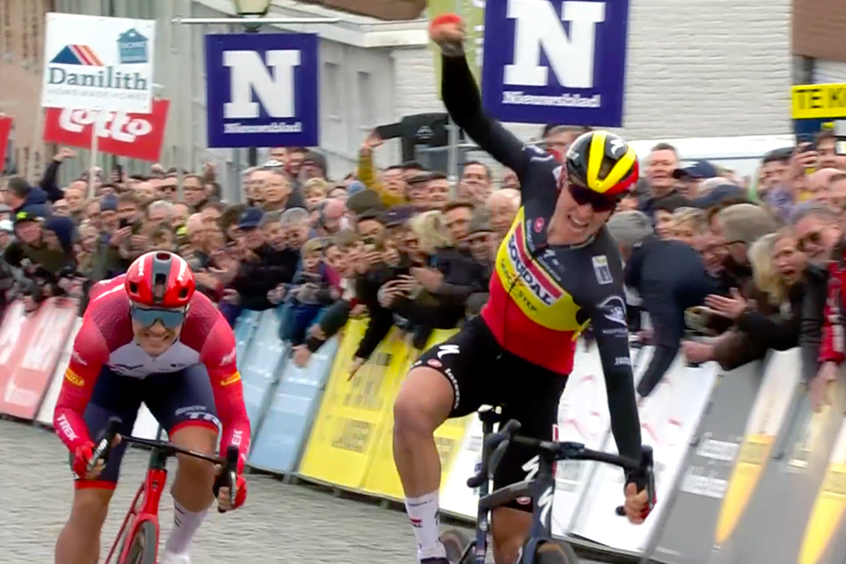 A quel punto, Tim Merlier non ha dovuto fare altro che aprire il gas e, dimostrando un colpo di pedale pazzesco rispetto ai rivali, guadagnarsi nuovamente il gradino più alto del podio di Nokere.
