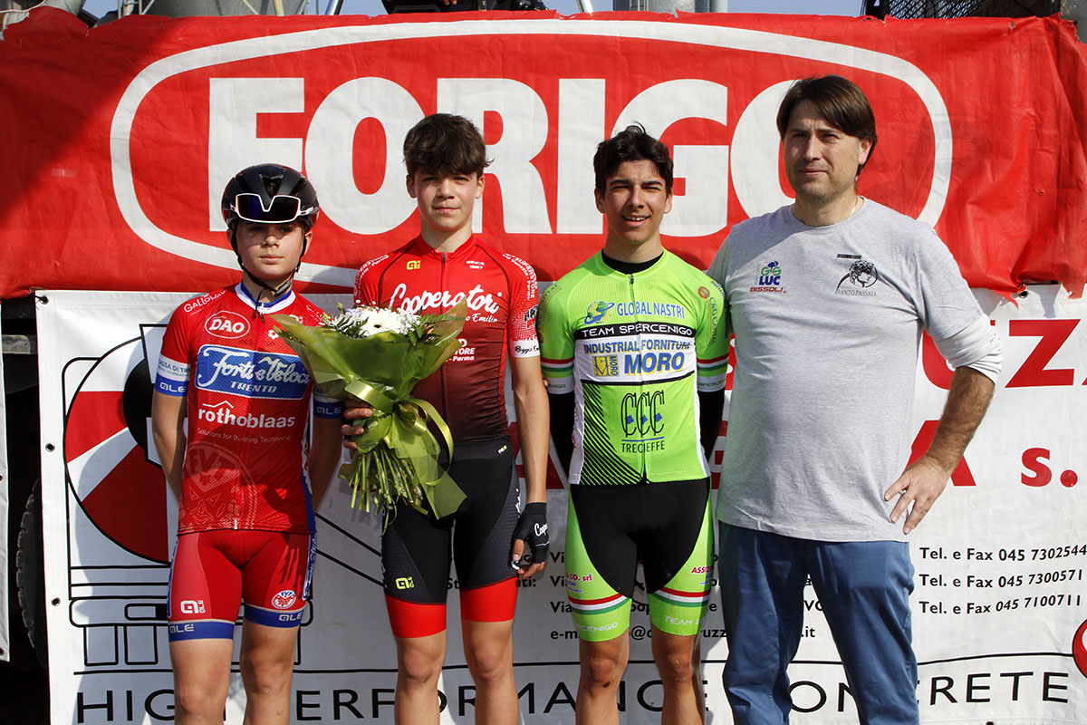 Il dodicenne, nato l’11 maggio 2010, ha preceduto allo sprint il trentino Giacomo Carlin (Forti e Veloci) e Gioele Angelo Libertani, portacolori della Industrial Forniture Moro (l’arrivo nella foto di Photobicicailotto).