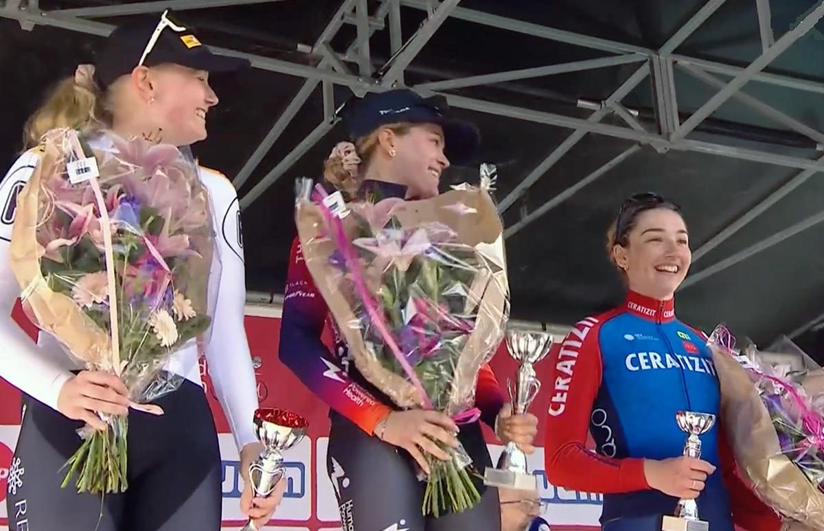 MOUSCRON (BEL) – È mancata mezza bicicletta alla bergamasca Martina Fidanza per festeggiare uno storico bis alla Ronde de Mouscron. La vincitrice uscente, che in caso di successo sarebbe stata la prima a scrivere due volte il suo nome nel giovane albo d’oro della corsa belga, è stata preceduta allo sprint dalla polacca Daria Pikulik, portacolori della Human Powered Health, e dalla finlandese Ahtosalo, atleta della Uno-X Mobility (nella foto, il podio).