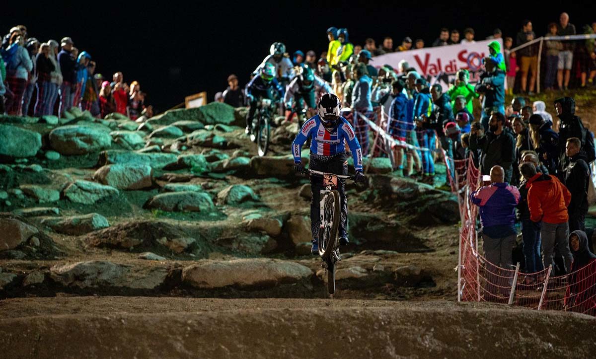 DAOLASA DI COMMEZZADURA (TN) – La lunga giornata di Daolasa di Commezzadura (Trento) si è conclusa con i Campionati del Mondo di Four-Cross, andati in scena in Val di Sole per la quinta edizione consecutiva, davanti a un pubblico delle grandi occasioni, accorso numeroso nonostante la pioggia e il freddo che nel pomeriggio hanno condizionato lo Short Track e le qualifiche del Downhill.
