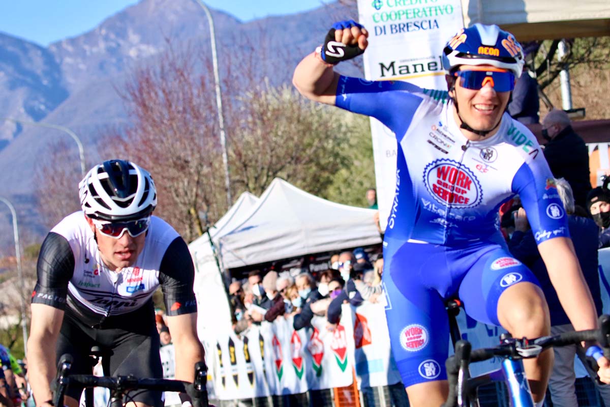 SAN FELICE DEL BENACO (BS) – Secondo un anno fa, primo oggi. Il trentino Samuele Zambelli (Work Service Group Vitalcare Vega) ha vinto la 98esima edizione della Coppa San Geo, abbinata al 52° Trofeo Caduti Soprazocco-Memorial Giancarlo Otelli-Attilio Necchini, classica di apertura del calendario nazionale Elite e Under 23, corsa oggi da Ponte San Marco a San Felice del Benaco, per un totale di 153,100 chilometri. Al termine di un’emozionante sprint a due Zambelli ha avuto la meglio del britannico Matthew Kingston (Zappi Racing Team). Il corridore inglese aveva provato ad anticipare dentro l’ultimo chilometro, Zambelli ha giocato d’astuzia, a tenuto a tiro la sua ruota e lo ha battuto in volata, in rimonta, grazie all’ultimo colpo di reni. Terzo il bergamasco Davide Persico (Team Colpack Ballan), il vincitore uscente.