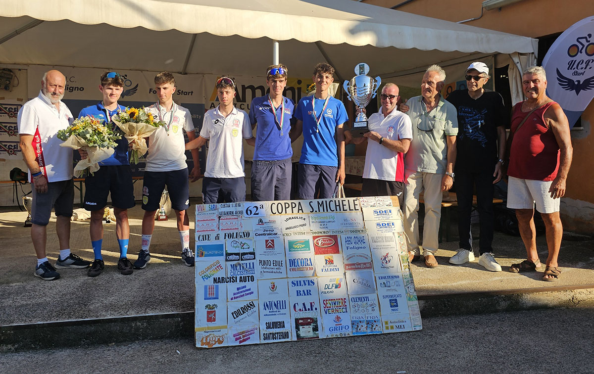Un vincitore più che degno del prestigioso albo d’oro di una corsa che ha saputo, anche in questa sua veste estiva, riscuotere ampi consensi dai partecipanti e dagli appassionati. Grande soddisfazione a livello organizzativo per la SC Maria Giuliana e per l’Unione Ciclistica Foligno, con quest’ultima protagonista fino all’ultimo anche in gara con la 6° piazza di Giacomo Serangeli (passato in testa anche sul GPM di Montefalco) e la 10° di Alessandro Caon. Per quel che concerne di premi simbolo della manifestazione Santiago Ferraro si è quindi aggiudicato la Medaglia d’Oro in memoria di Peppe Casini e Mario Proietti, mentre la GS Work Service Coratti ha alzato, in quanta squadra del vincitore, la sempre magnifica coppa in onore di San Michele. Sul podio spazio anche per Damiano Buttarazzi e Nicolò Pizzi, transitati per primi rispettivamente sui GPM di Montepennino e di Pietrauta, nel primo caso dividendosi i due passaggi di giornata.