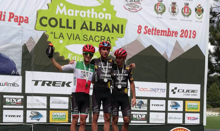 ROCCA DI PAPA (RM) – Il Team Trek Selle San Marco domina la Marathon Colli Albani. Sul percorso di 73 km è stato un assolo del team infatti i ragazzi nero/gialli hanno conquistato i primi 4 posti della classifica. Damiano Ferraro primo, Samuele Porro 2°, Michele Casagrande 3° e Fabian Rabensteiner 4°.