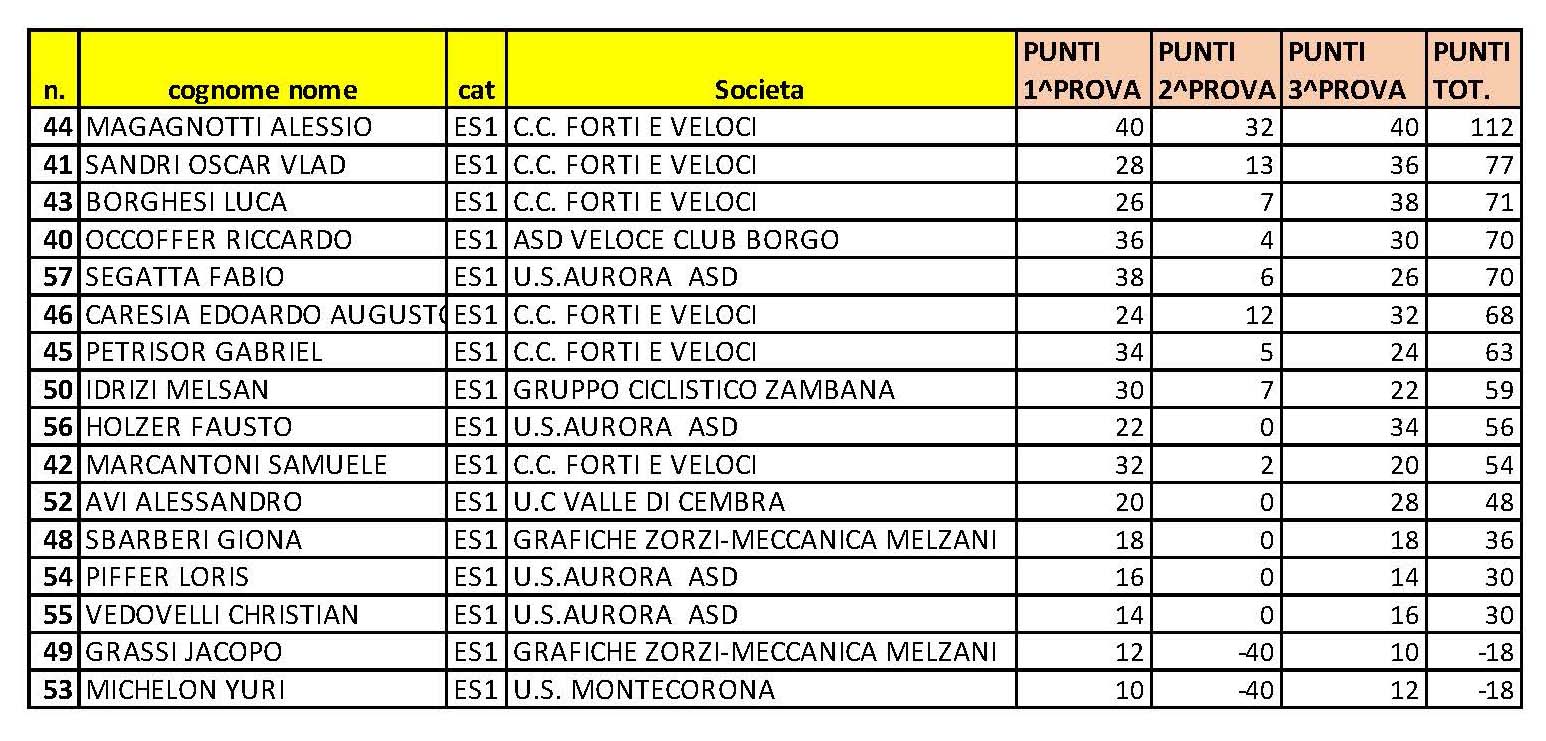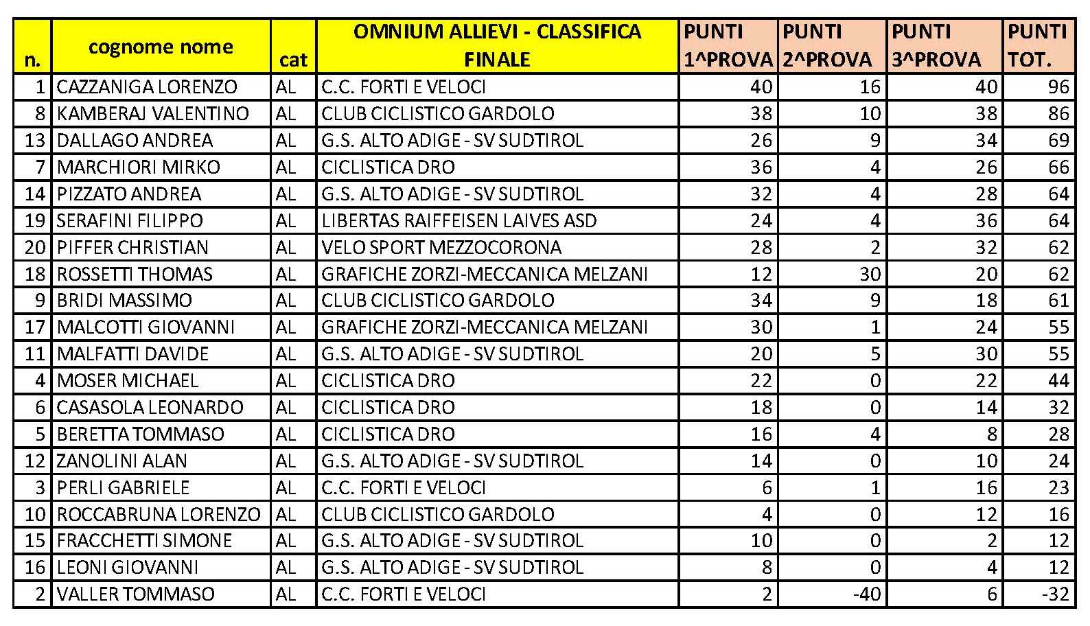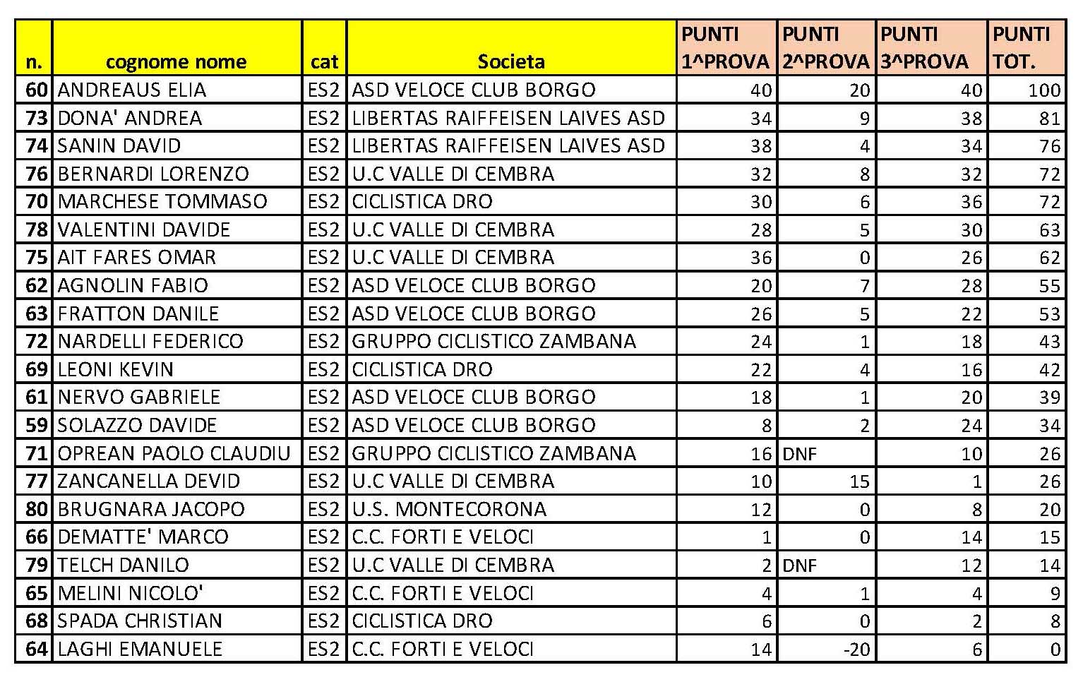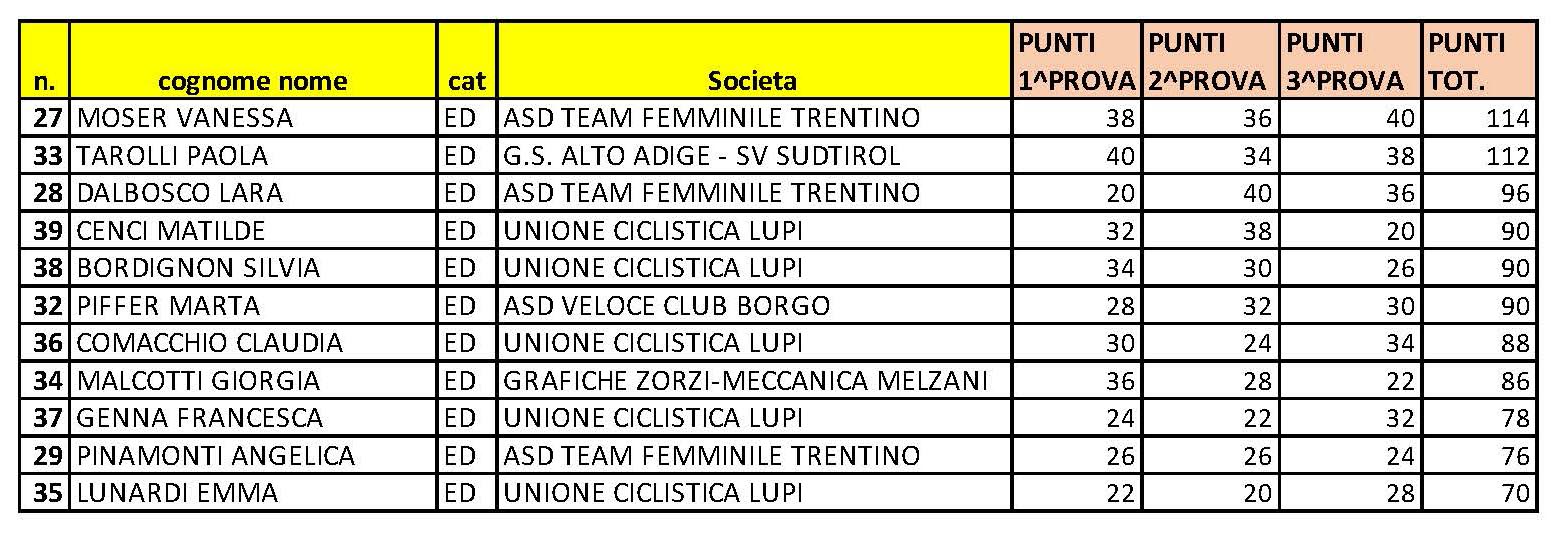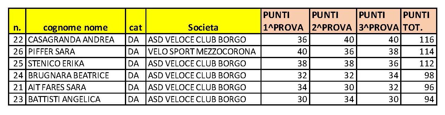 Vittorie per l’allieva Andrea Casagranda (Veloce Club Borgo), l’allievo Lorenzo Cazzaniga (Forti e Veloci), gli esordienti Vanessa Moser (Team Femminile Trentino), Elia Andreaus (Veloce Club Borgo) tra i 2° anno e Alessio Magagnotti (Forti e Veloci) tra i 1° anno.