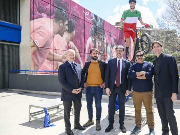 L'opera di 23 metri, realizzata da Giulio Gebbia, in arte Rosk, domina la stazione “Marconi” della Linea B della metropolitana.