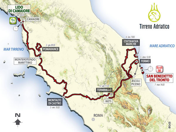 Dall'8 al 14 marzo, da Lido di Camaiore a San Benedetto del Tronto con due cronometro (una a squadre e una individuale), due tappe per velocisti, due per finisseur e un arrivo in quota sul Terminillo.