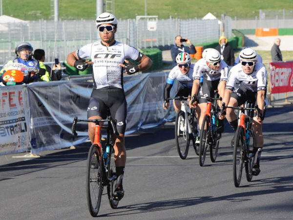 Il triestino del Cycling Team Friuli Victorious precede allo sprint il compagno di squadra Zak Erzen e Simone Buda.