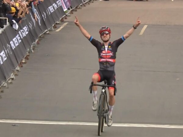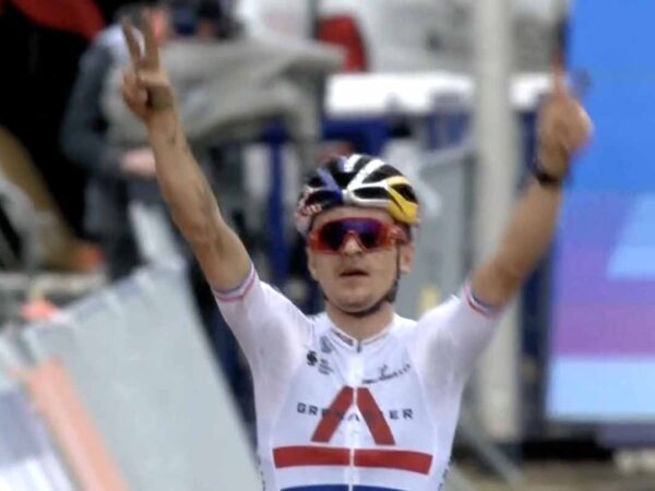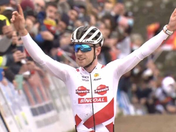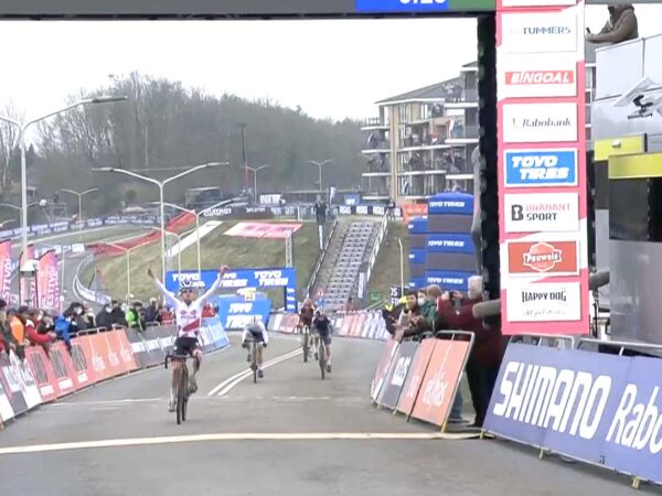 Il belga della Jumbo Visma piega Mathieu Van der Poel e Tom Pidcock in volata; la 20enne olandese fa il vuoto alle sue spalle.