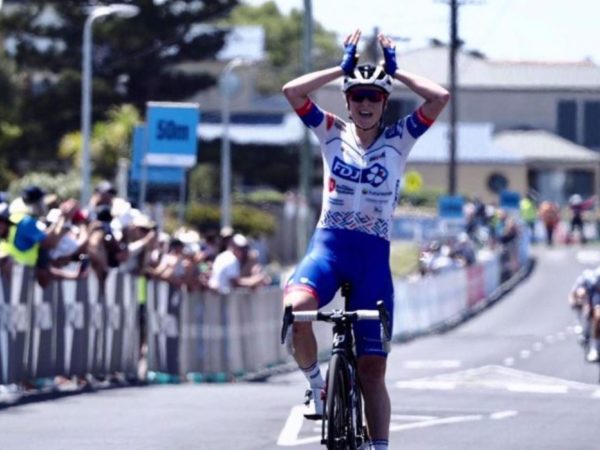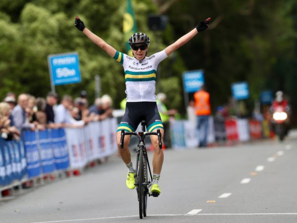 Brodie Chapman festeggia sulle strade di casa dove oggi, con un assolo, ha vinto l'edizione inaugurale della Race Torquay Women Elite.
