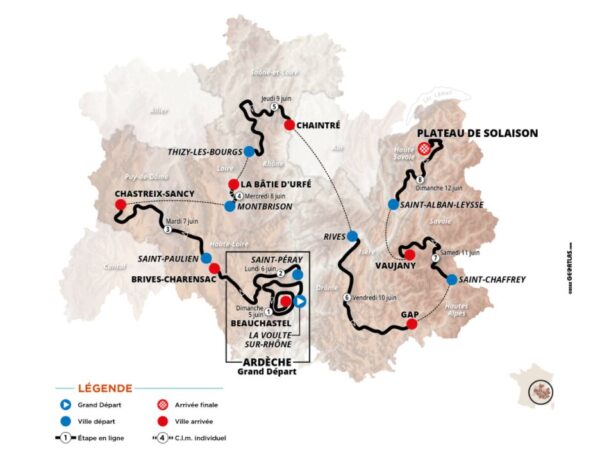 Il percorso dell'edizione 74 del Critérium du Dauphiné, in programma dal 5 al 12 giugno, che partirà per la prima volta dall'Ardèche.