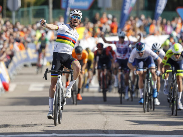 Il campione del mondo vince la volata di Viana sfruttando il lavoro del compagno Remco Evenepoel. Completano il podio Fabien Doubey e Quinten Hermans.
