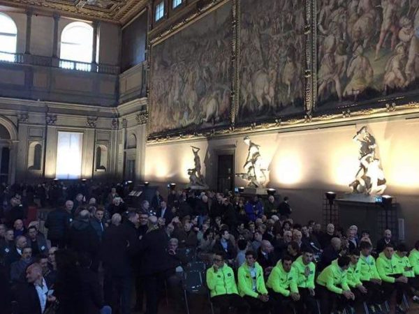 Lo splendido scenario del Salone dei Cinquecento di Palazzo Vecchio a Firenze ha ospitato la presentazione della Hopplà - Petroli Firenze, che sarà formazione satellite del team Tinkoff.