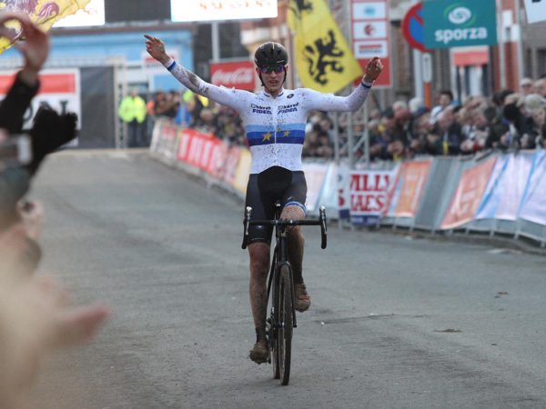 La maglia di campione europeo esalta il belga Toon Aerts che oggi ha vinto il Jarmaartkcross, terza prova del Soudal Classics disputata a Niel, in Belgio.