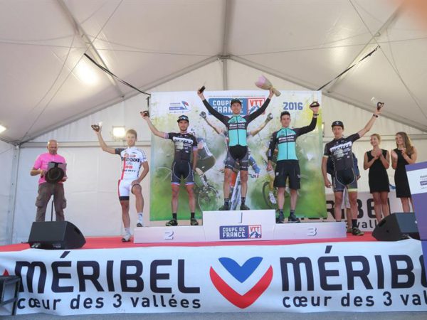 Festa per il Team Bianchi Countervail sul podio della gara di cross country Elite nella quarta prova della Coupe de France VTT disputata a Méribel.