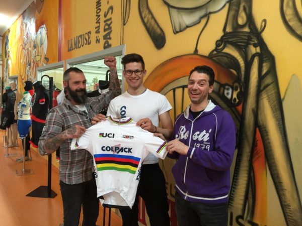Il campione del mondo dell’Inseguimento a squadre Filippo Ganna del Team Colpack è stato oggi in visita a Brembate (Bergamo) nella sede del maglificio Rosti.