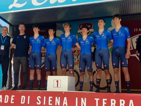 Renato Favero, Alessandro Cattani, Samuele Alari, Luca Giaimi, Ludovico Mellano e Alessandro Borgo vincono la cronosquadre davanti all'Olanda.