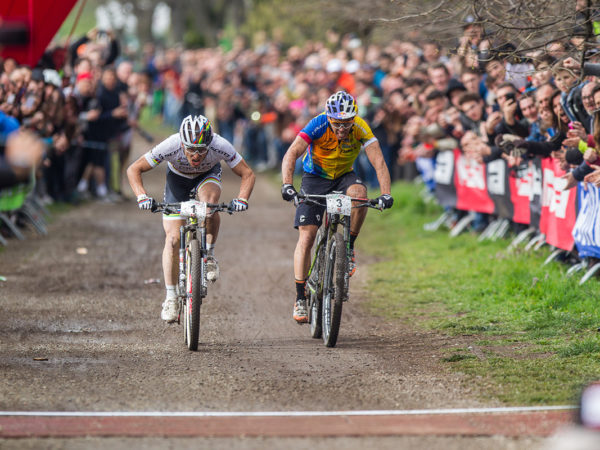 Testa a testa entusiasmante tra il campione del mondo Nino Schurter e il plurititolato Julien Absalon nella prova di Coppa del Mondo disputata ad Albstadt, in Germania.
