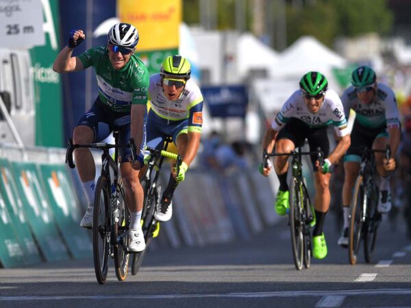 Il belga esulta troppo presto e viene superato dal colpo di reni del danese della EF Education Easypost. Settimo Nicola Conci.